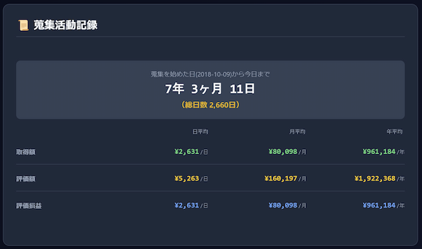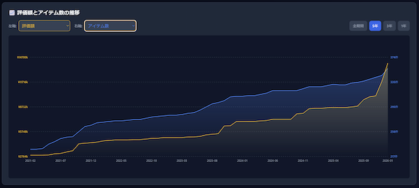 評価額の変遷履歴を時系列グラフで追跡。様々な統計分析を搭載、ユーザーの要望にお応えして、収集ペースから将来の資産価値を予測するシミュレーターも搭載。